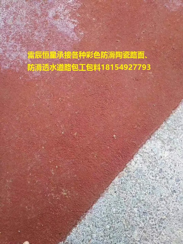 彩色路面施工施工工藝:  1、底漆—底涂—骨料—面涂 (多用于機動車道)  2、底漆一刮涂(涂料+骨料)一刻紋 (多用于自行車行人道) 2、底油—面漆(刮涂)—刻紋(多用于自行車道) 彩色路面施工工序  1、到達施工現場:根據施工要求,準時或提早到達施工現場。  2、設置安全措施:根據路面寬度、交通流量等因素,充分利用交通標志、交通錐、路欄、警戒帶等安全設施設置施工范圍。配備交通管理員,戴肩章、警笛、紅旗,注意來往車輛、行人,確保施工人員安全。  3、清潔路面:用打磨機、鋼絲刷、掃把,徹底清除路面上的灰塵、水分和油污,后用清洗機徹底清洗地面,待地面干燥后在施工地面上涂敷底油。  4、粘貼膠紙與攪拌涂料:地面清潔干凈后,根據施工要求進行彈線,按照彈線標準粘貼膠紙;同時在涂料中加入適當比例的固化劑,進行攪拌;  5、底涂:把攪拌均勻的涂料用刮涂工具均勻敷涂于路面上(使用刮板或刮刀) 6、撒布骨料:在底涂沒有干燥前均勻撒布  7、面涂:待底涂完全固化后,用刮涂工具均勻敷涂與路面上(使用滾筒或者耙子)  8、修理和撤除圍護措施:施工結束后,應該根據實際完全情況,計測工作量,對不符合要求的路面進行修整,想辦法除去溢出和不規則的涂膜,檢查厚度、尺寸。檢查施工路面的尺寸及圖案是否符合圖紙要求,并撤除圍護措施,開放交通。