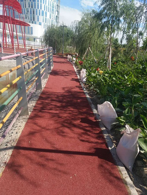 1.現在政府提倡城市綠化,道路美化工程也在逐漸增多,一些自行車道,健身步道和景區步道的彩色防滑路面做的很多,材料也是參差不齊,一般要滿足耐磨防滑,不易褪色,使用壽命長的功能,你可以咨詢鴻坤的彩色防滑路面材料,使用綠道樹脂上面撒是陶瓷顆粒施工,做出來的效果如下圖: